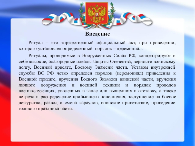 смирно, равнение – на - право!». Оркестр исполняет «Встречный марш». Командир воинской части подходит к лицу, прибывшему для вручения Боевого знамени, и докладывает, что полк для вручения Боевого знамени построен. Со знамени снимается чехол, оно разворачивается, вручающий зачитывает Грамоту Президента РФ и вручает Боевое знамя и Грамоту командиру воинской части. Оркестр исполняет Государственный гимн. Командир и знаменщик с ассистентами с Боевым знаменем обходят строй воинской части, после чего военнослужащие проходят торжественным маршем.
