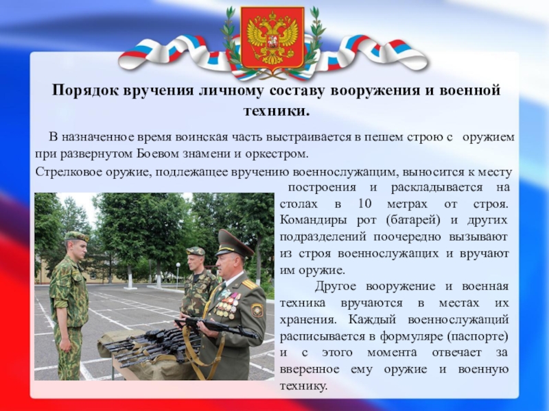 построения и раскладывается на столах в 10 метрах от строя. Командиры рот (батарей) и других подразделений поочередно вызывают из строя военнослужащих и вручают им оружие.