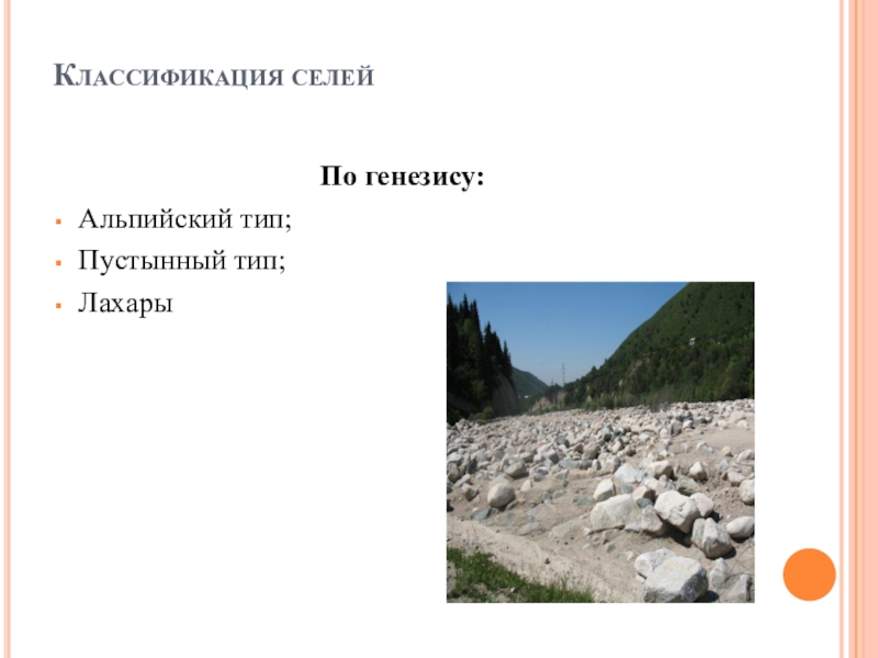Классификация селей По генезису:Альпийский тип;Пустынный тип;Лахары