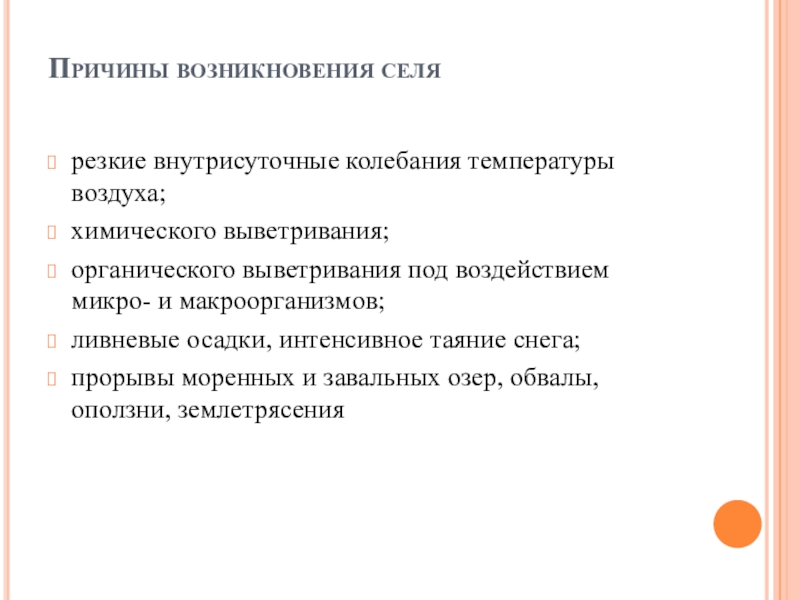 Причины возникновения селя резкие внутрисуточные колебания температуры воздуха;химического выветривания;органического выветривания под воздействием микро- и макроорганизмов;ливневые осадки,