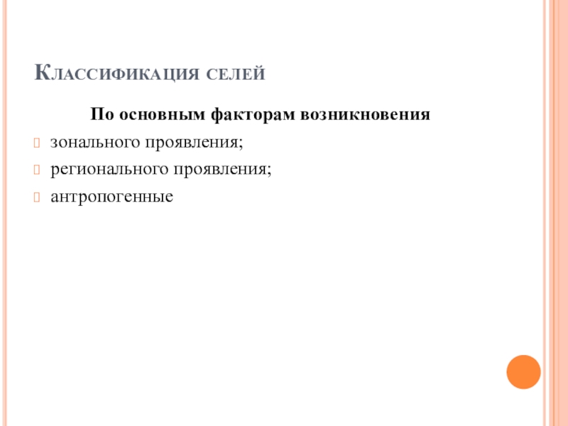 Классификация селейПо основным факторам возникновениязонального проявления;регионального проявления;антропогенные