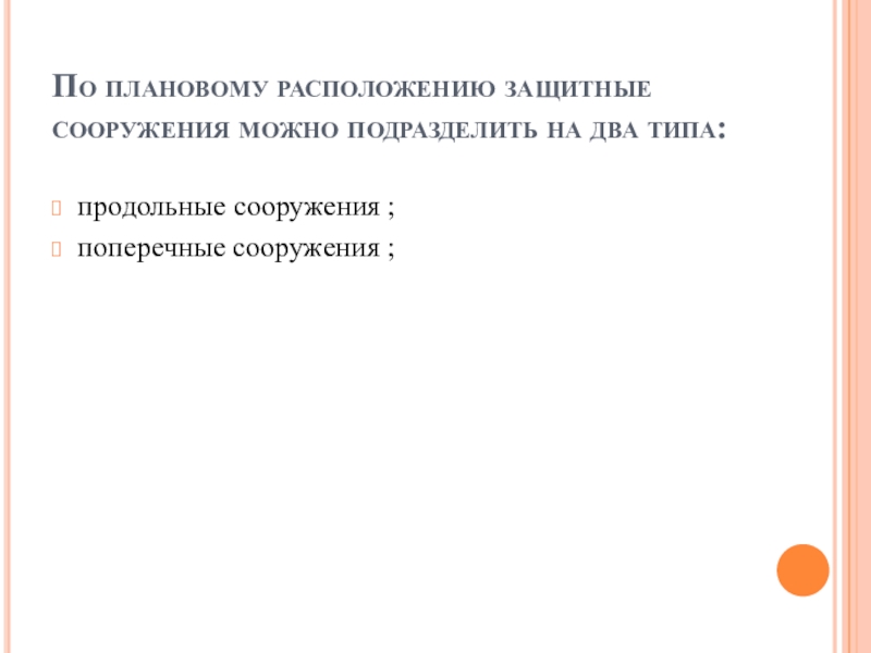 По плановому расположению защитные сооружения можно подразделить на два типа:продольные сооружения ;поперечные сооружения ;