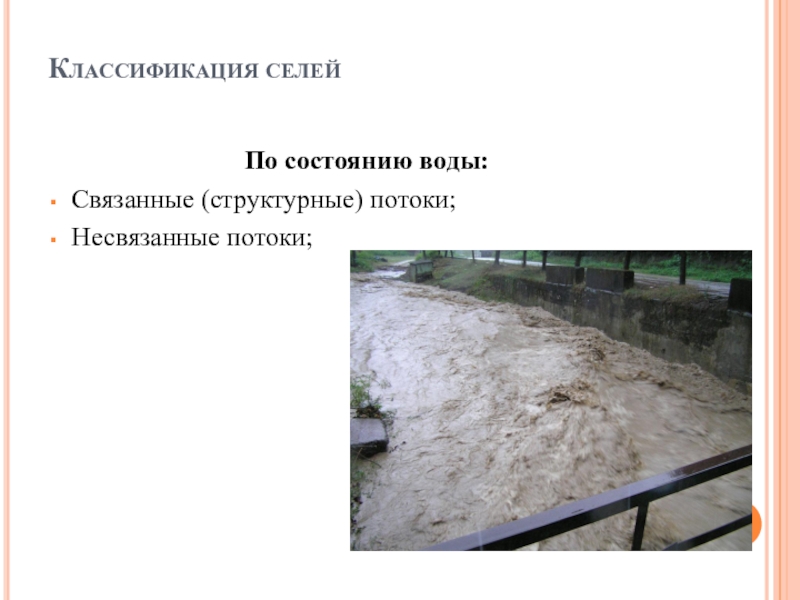Классификация селей По состоянию воды:Связанные (структурные) потоки;Несвязанные потоки;