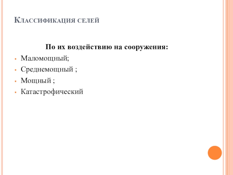 Классификация селей По их воздействию на сооружения:Маломощный;Среднемощный ;Мощный ;Катастрофический