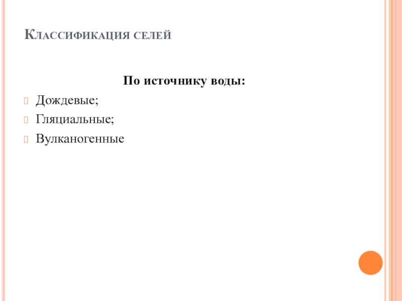 Классификация селей По источнику воды:Дождевые;Гляциальные;Вулканогенные