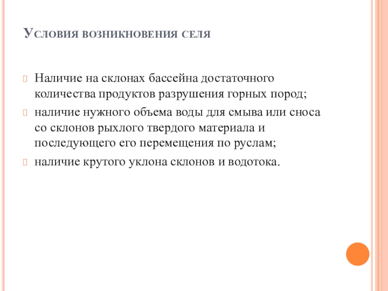 Условия возникновения селя Наличие на склонах бассейна достаточного количества продуктов разрушения горных пород;наличие нужного объема воды