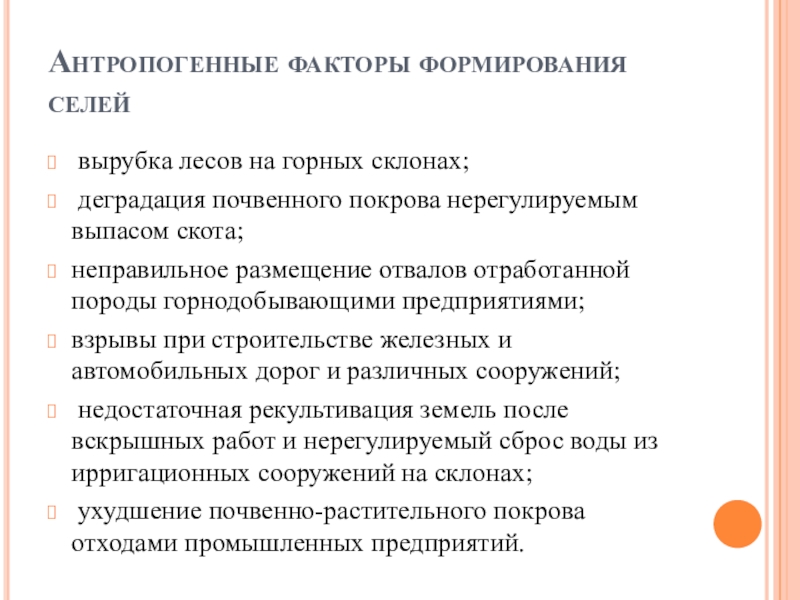 Антропогенные факторы формирования селей  вырубка лесов на горных склонах; деградация почвенного покрова нерегулируемым выпасом скота;неправильное размещение отвалов отработанной