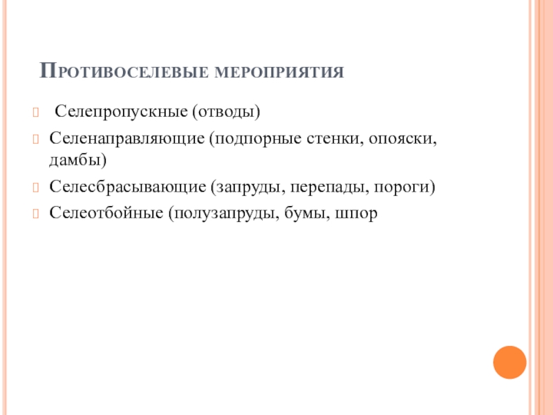 Противоселевые мероприятия Селепропускные (отводы)Селенаправляющие (подпорные стенки, опояски, дамбы)Селесбрасывающие (запруды, перепады, пороги)Селеотбойные (полузапруды, бумы, шпор
