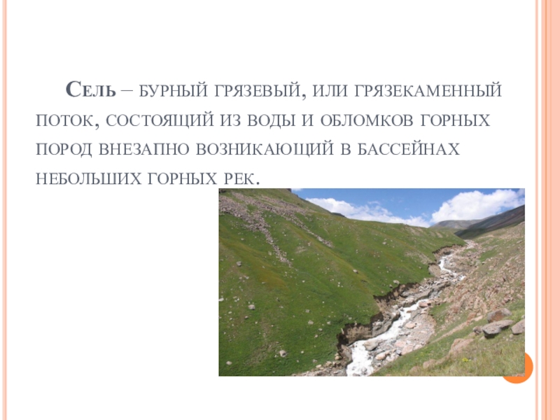 Сель – бурный грязевый, или грязекаменный поток, состоящий из воды и обломков горных пород внезапно возникающий в бассейнах небольших горных рек.