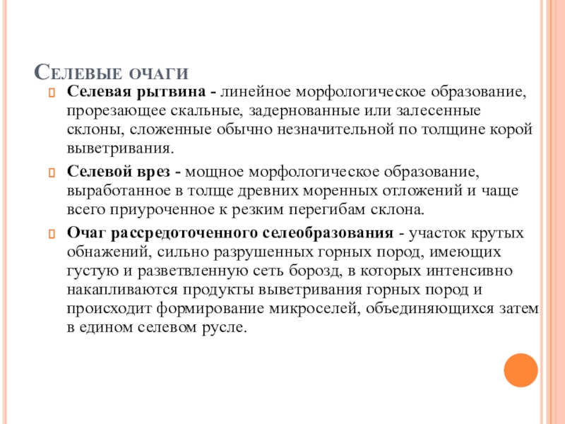 Селевые очагиСелевая рытвина - линейное морфологическое образование, прорезающее скальные, задернованные или залесенные склоны, сложенные обычно незначительной по