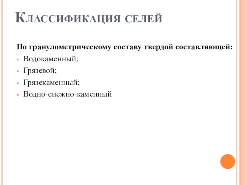 Классификация селей По гранулометрическому составу твердой составляющей:Водокаменный;Грязевой;Грязекаменный;Водно-снежно-каменный