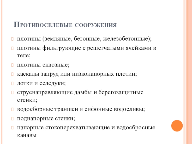 Противоселевые сооруженияплотины (земляные, бетонные, железобетонные);плотины фильтрующие с решетчатыми ячейками в теле;плотины сквозные;каскады запруд или низконапорных плотин;лотки и