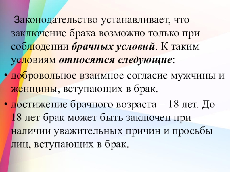 достижение брачного возраста – 18 лет. До 18 лет брак может быть заключен при наличии уважительных причин и просьбы лиц, вступающих в брак.