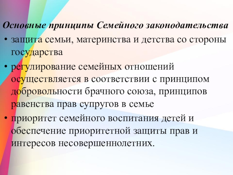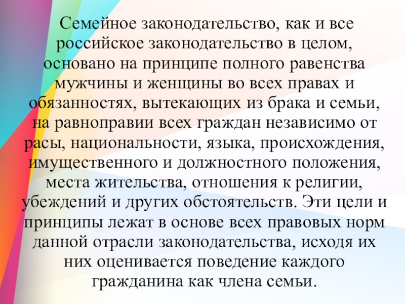 Слайд 13 Семейное законодательство, как и все российское законодательство в целом, основано на