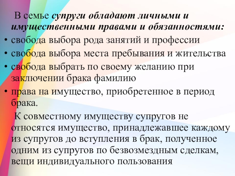 Слайд 8 В семье супруги обладают личными и имущественными правами и обязанностями: