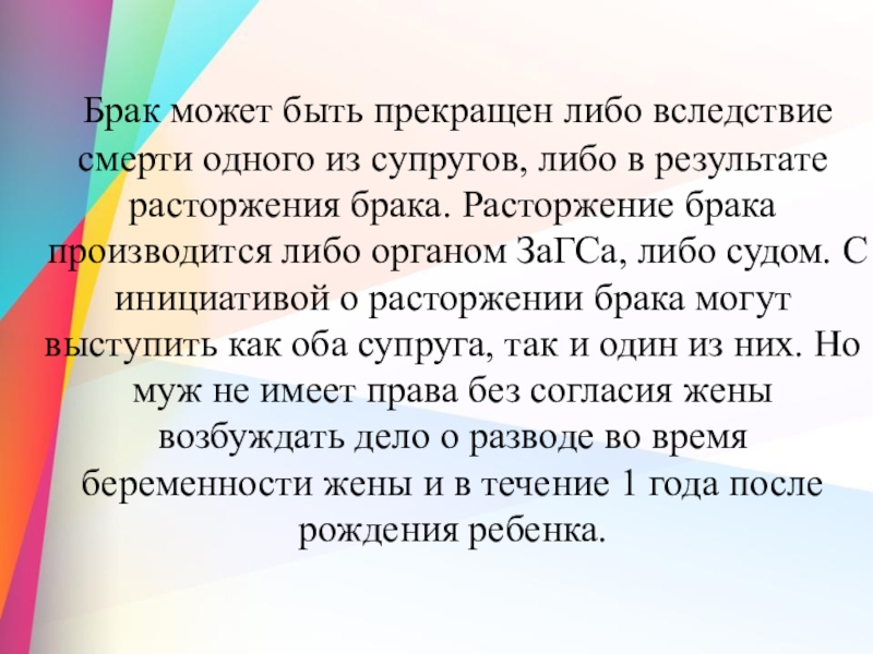 Слайд 7 Брак может быть прекращен либо вследствие смерти одного из супругов, либо