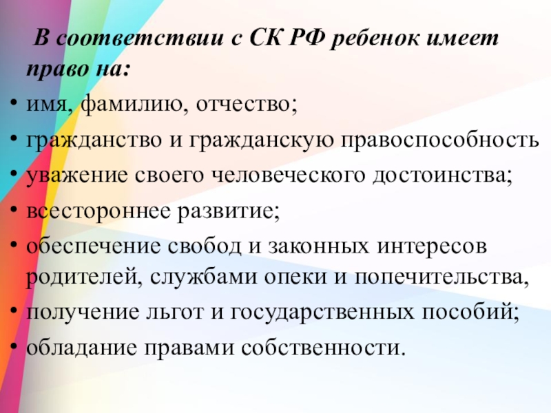Слайд 12 В соответствии с СК РФ ребенок имеет право на: