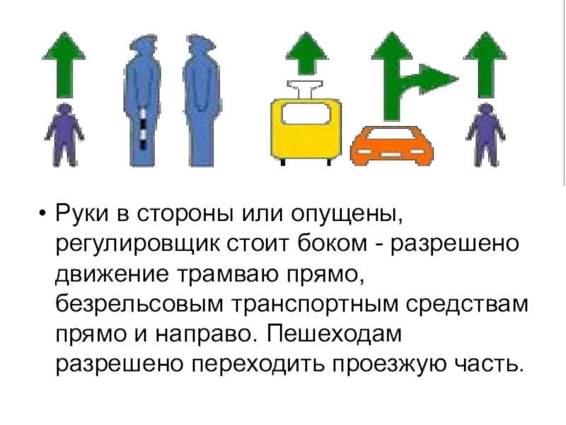 Руки в стороны или опущены, регулировщик стоит боком - разрешено движение трамваю прямо, безрельсовым транспортным средствам прямо
