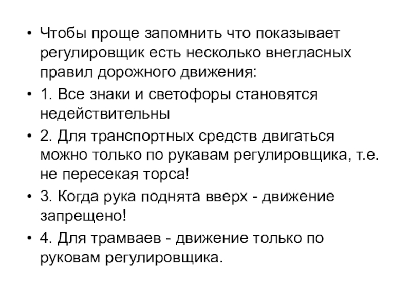 Слайд 2Чтобы проще запомнить что показывает регулировщик есть несколько внегласных правил дорожного