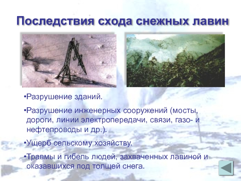 Последствия схода снежных лавинРазрушение зданий.Разрушение инженерных сооружений (мосты, дороги, линии электропередачи, связи, газо- и нефтепроводы и др.).Ущерб