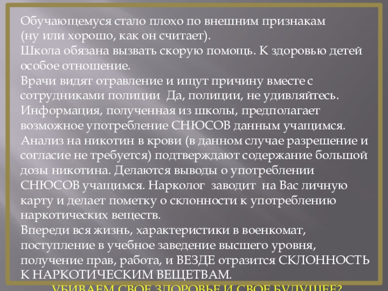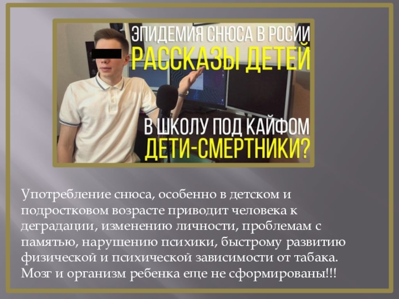 Слайд 13Употребление снюса, особенно в детском и подростковом возрасте приводит человека к