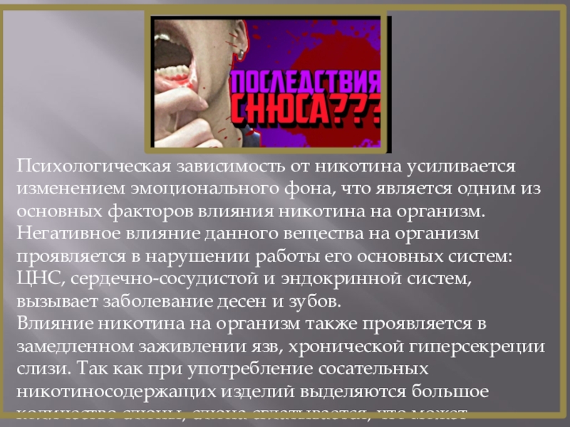 Слайд 11Психологическая зависимость от никотина усиливается изменением эмоционального фона, что является одним