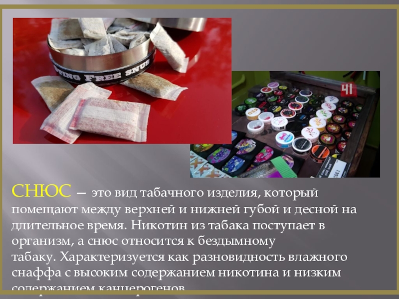 Слайд 2СНЮС — это вид табачного изделия, который помещают между верхней и