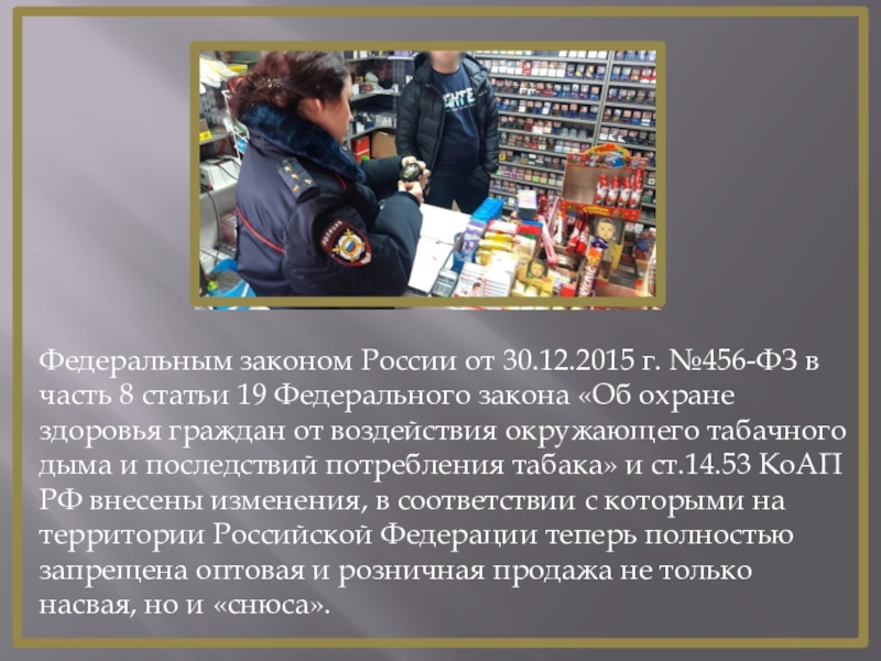 19 Федерального закона «Об охране здоровья граждан от воздействия окружающего табачного дыма и последствий потребления табака» и ст.14.53 КоАП РФ внесены изменения, в соответствии с которыми на территории Российской Федерации теперь полностью запрещена оптовая и розничная продажа не только насвая, но и «снюса».