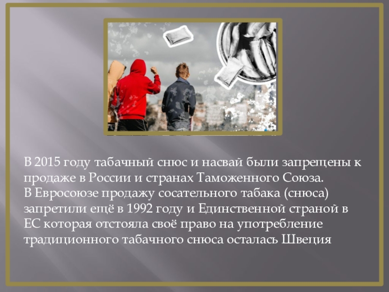 Слайд 5В 2015 году табачный снюс и насвай были запрещены к продаже