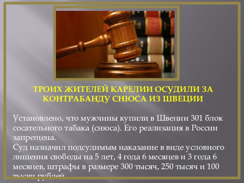 Слайд 7ТРОИХ ЖИТЕЛЕЙ КАРЕЛИИ ОСУДИЛИ ЗА КОНТРАБАНДУ СНЮСА ИЗ ШВЕЦИИ