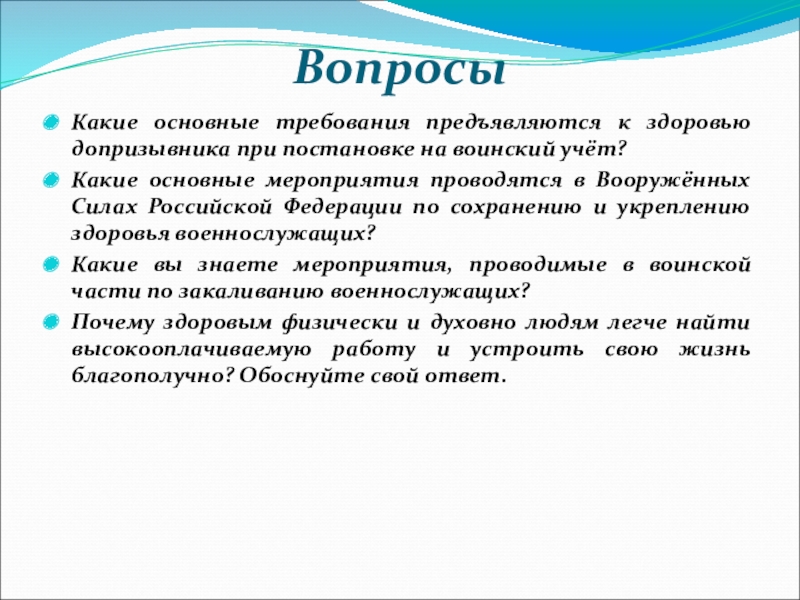 Такое глубокое изучение состояния физического и духовного здоровья гражданина, подлежащего призыву на военную службу, свидетельствует о настоятельной необходимости в комплектовании Вооружённых Сил здоровым пополнением. Служба в армии даже в мирное время требует от каждого военнослужащего высоких духовных качеств и высокого уровня физического здоровья.