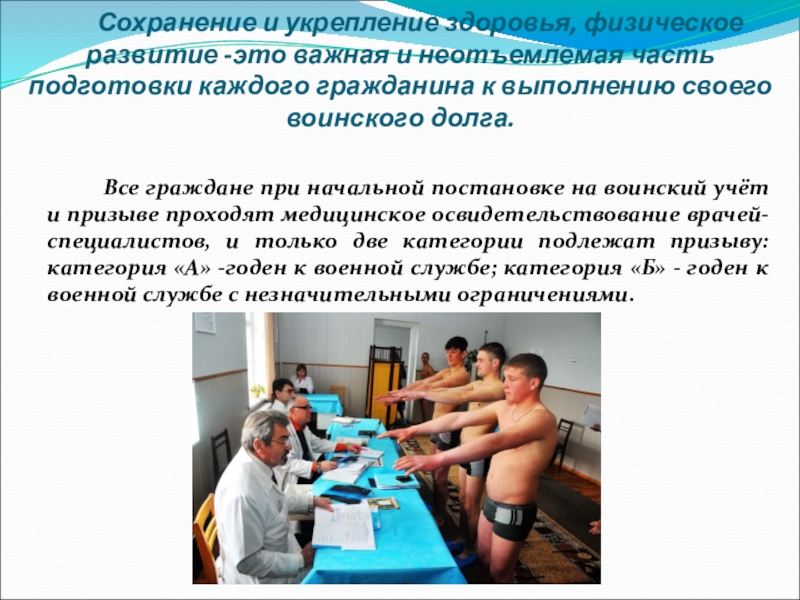 Все граждане при начальной постановке на воинский учёт и призыве проходят медицинское освидетельствование врачей-специалистов, и только две категории подлежат призыву: категория «А» -годен к военной службе; категория «Б» - годен к военной службе с незначительными ограничениями.