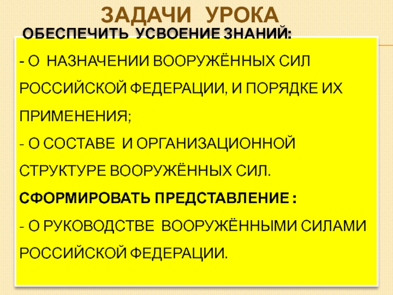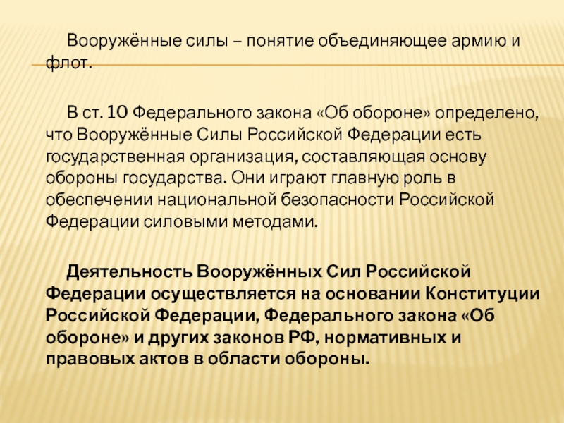 закона «Об обороне» определено, что Вооружённые Силы Российской Федерации есть государственная организация, составляющая основу обороны государства. Они играют главную роль в обеспечении национальной безопасности Российской Федерации силовыми методами.