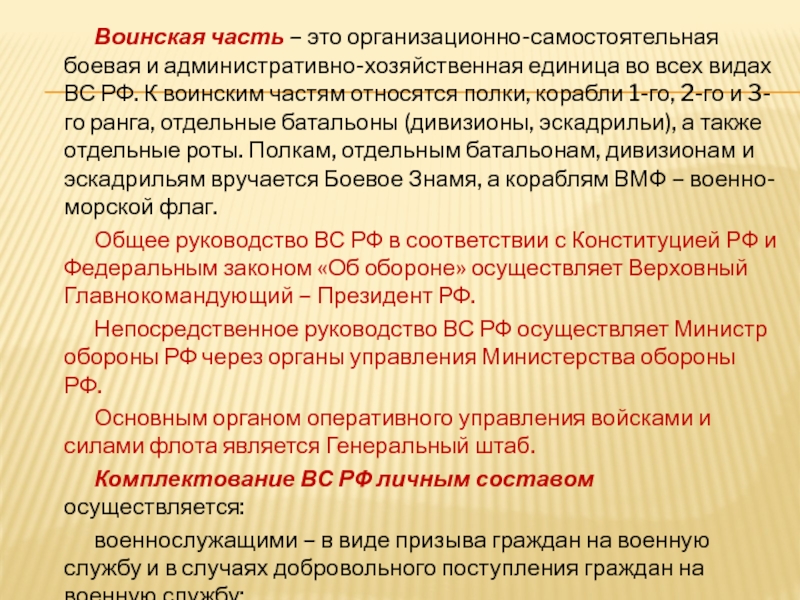 видах ВС РФ. К воинским частям относятся полки, корабли 1-го, 2-го и 3-го ранга, отдельные батальоны (дивизионы, эскадрильи), а также отдельные роты. Полкам, отдельным батальонам, дивизионам и эскадрильям вручается Боевое Знамя, а кораблям ВМФ – военно-морской флаг.