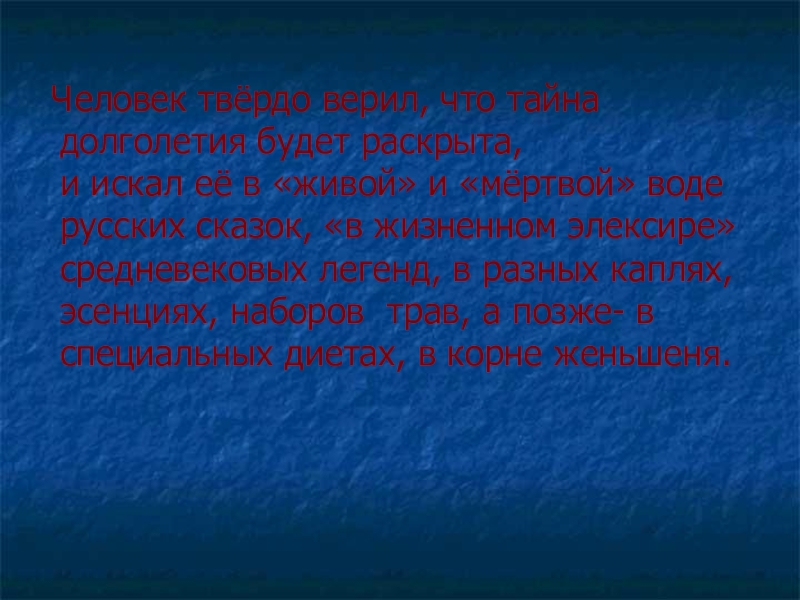 и искал её в «живой» и «мёртвой» воде русских сказок, «в жизненном элексире» средневековых легенд, в разных каплях, эсенциях, наборов трав, а позже- в специальных диетах, в корне женьшеня.