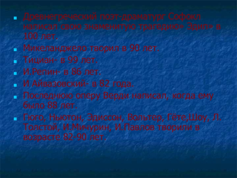 Гюго, Ньютон, Эдиссон, Вольтер, Гёте,Шоу, Л.Толстой, И.Мичурин, И.Павлов творили в возрасте 82-90 лет.