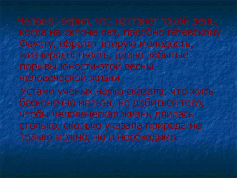Устами учёных наука сказала, что жить бесконечно нельзя, но добиться того, чтобы человеческая жизнь длилась столько, сколько указала природа не только можно, но и необходимо.