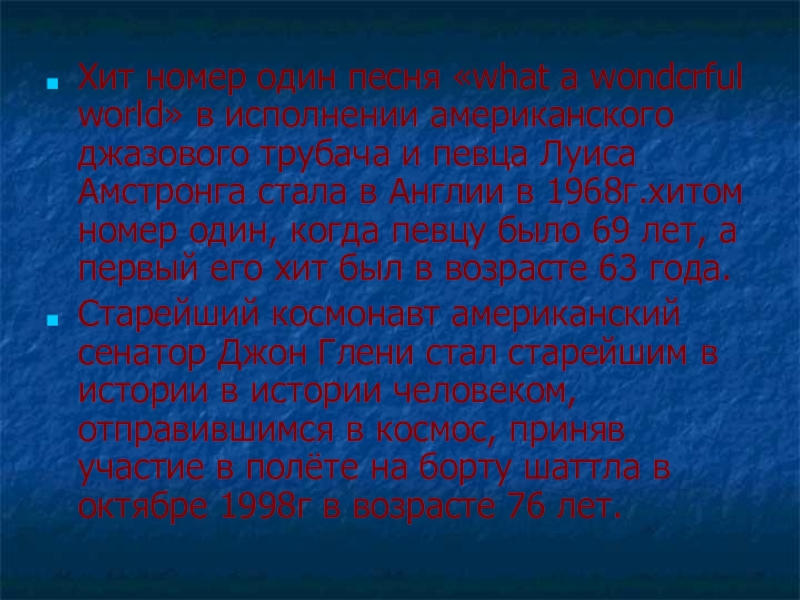 джазового трубача и певца Луиса Амстронга стала в Англии в 1968г.хитом номер один, когда певцу было 69 лет, а первый его хит был в возрасте 63 года.