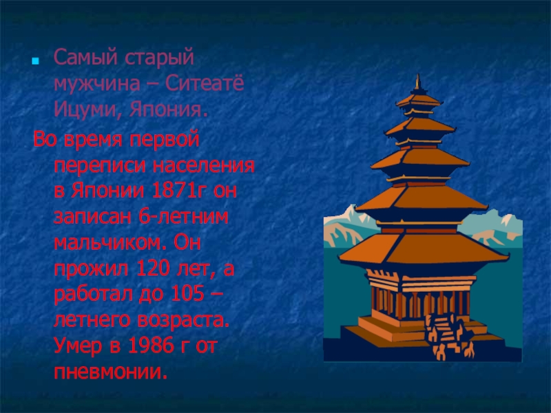 Слайд 14Самый старый мужчина – Ситеатё Ицуми, Япония.