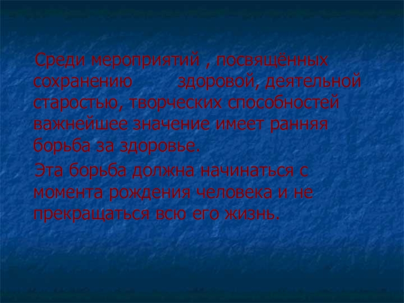 деятельной старостью, творческих способностей важнейшее значение имеет ранняя борьба за здоровье.