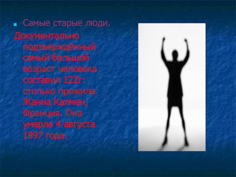 Документально подтверждённый самый большой возраст человека составил 122г: столько