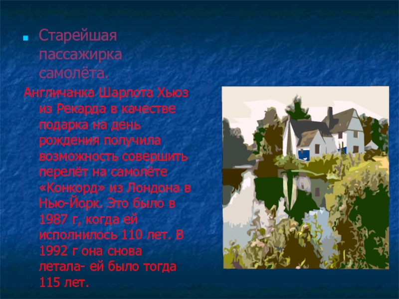 день рождения получила возможность совершить перелёт на самолёте «Конкорд» из Лондона в Нью-Йорк. Это было в 1987 г, когда ей исполнилось 110 лет. В 1992 г она снова летала- ей было тогда 115 лет.
