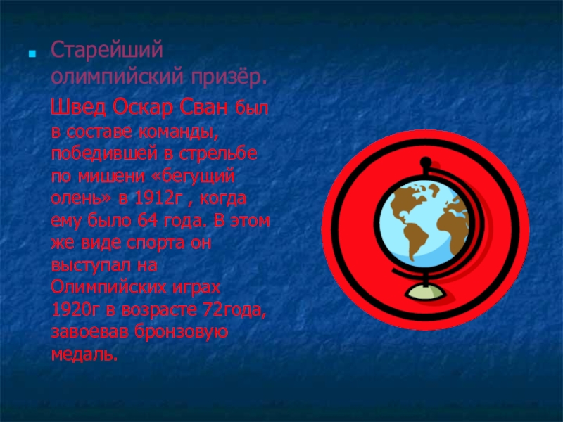 победившей в стрельбе по мишени «бегущий олень» в 1912г , когда ему было 64 года. В этом же виде спорта он выступал на Олимпийских играх 1920г в возрасте 72года, завоевав бронзовую медаль.