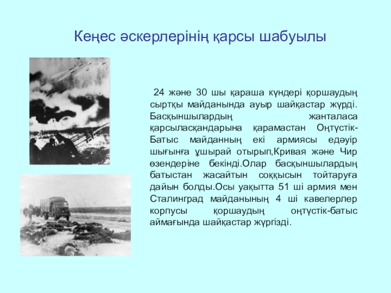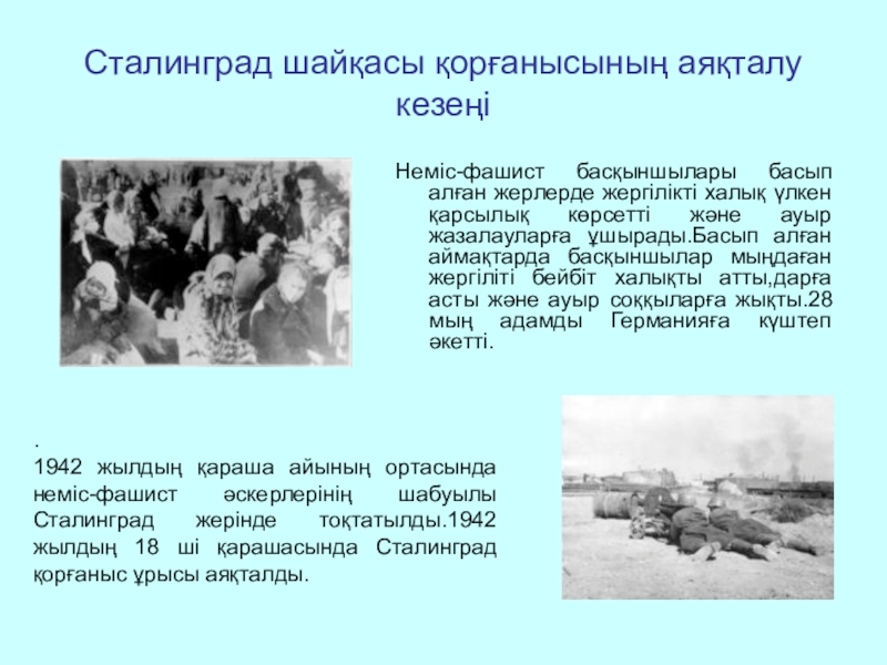 1942 жылдың қараша айының ортасында неміс-фашист әскерлерінің шабуылы Сталинград жерінде тоқтатылды.1942 жылдың 18 ші қарашасында Сталинград қорғаныс ұрысы аяқталды.