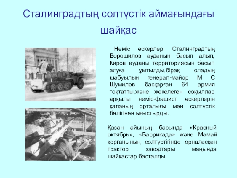 Неміс әскерлері Сталинградтың Ворошилов ауданын басып алып,Киров ауданы территориясын басып алуға ұмтылды,бірақ оладың шабуылын генерал-майор М С Шумилов басқарған 64 армия тоқтатты,және жекелеген соқыллар арқылы неміс-фашист әскерлерін қаланың орталығы мен солтүстік бөлігінен ығыстырды.