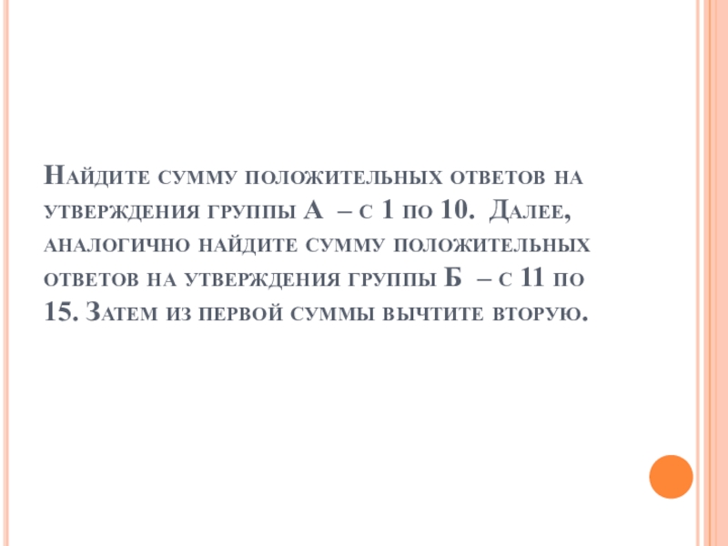 по 10. Далее, аналогично найдите сумму положительных ответов на утверждения группы Б – с 11 по 15. Затем из первой суммы вычтите вторую.