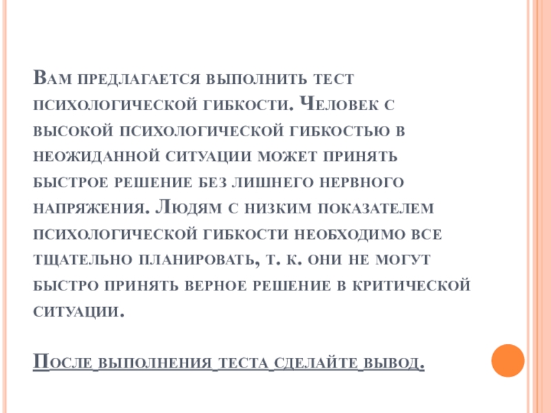 Слайд 15Вам предлагается выполнить тест психологической гибкости. Человек с высокой психологической гибкостью