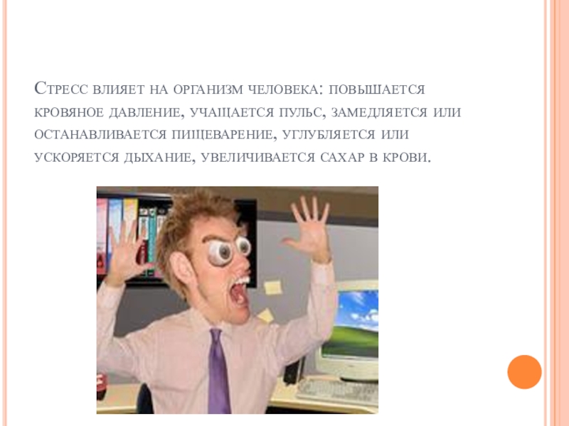 Слайд 7Стресс влияет на организм человека: повышается кровяное давление, учащается пульс, замедляется
