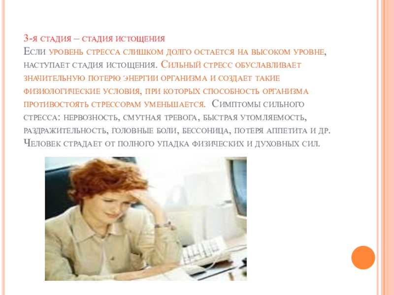 высоком уровне, наступает стадия истощения. Сильный стресс обуславливает значительную потерю энергии организма и создает такие физиологические условия, при которых способность организма противостоять стрессорам уменьшается. Симптомы сильного стресса: нервозность, смутная тревога, быстрая утомляемость, раздражительность, головные боли, бессоница, потеря аппетита и др. Человек страдает от полного упадка физических и духовных сил.