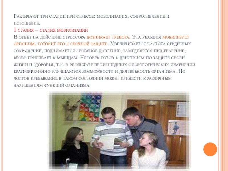 Слайд 8Различают три стадии при стрессе: мобилизация, сопротивление и истощение.